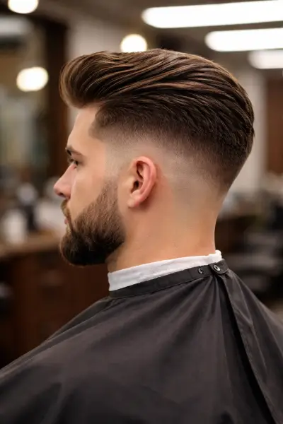 Corte clássico com acabamento moderno e barba desenhada